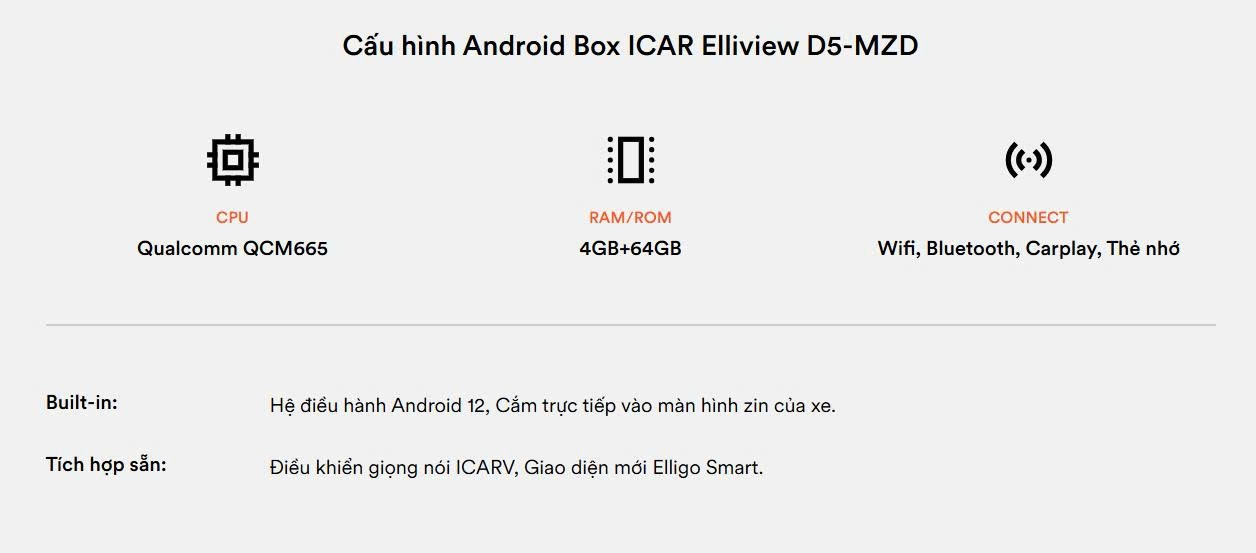 Bên cạnh đó, sở hữu Android Box Elliview D5-MZD của nhà ICAR, chủ nhân còn được tận hưởng các ứng dụng thông minh trong hệ sinh thái của ICAR như Điều khiển bằng giọng nói bằng Tiếng Việt ICAR V, Thế giới giải trí đa tầng ICAR Entertainment, Theo dõi – Định vị xe cực chuẩn Mycar+ kết hợp App ICAR và GSpeed – Cảnh báo tốc độ giới hạn trên Google Maps…