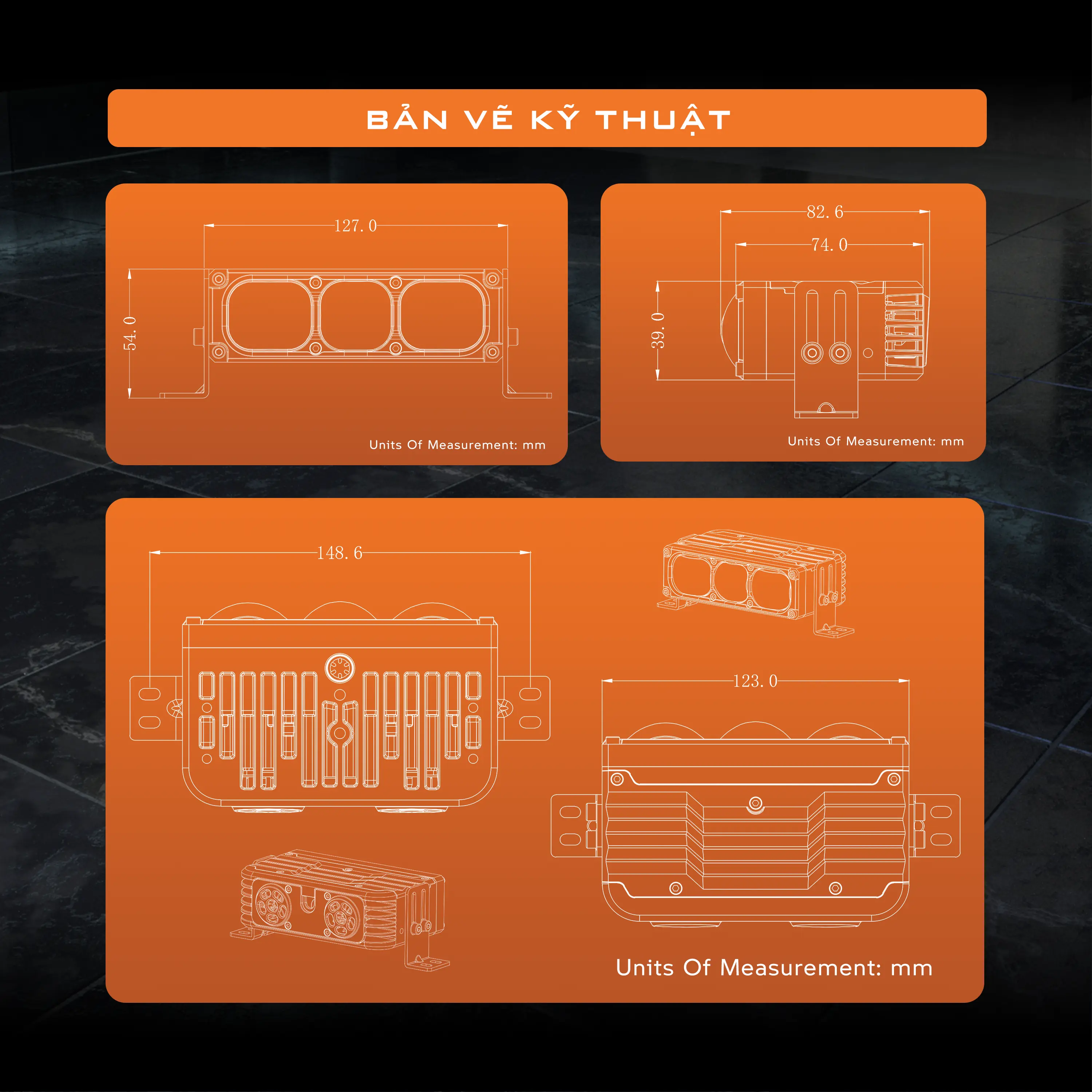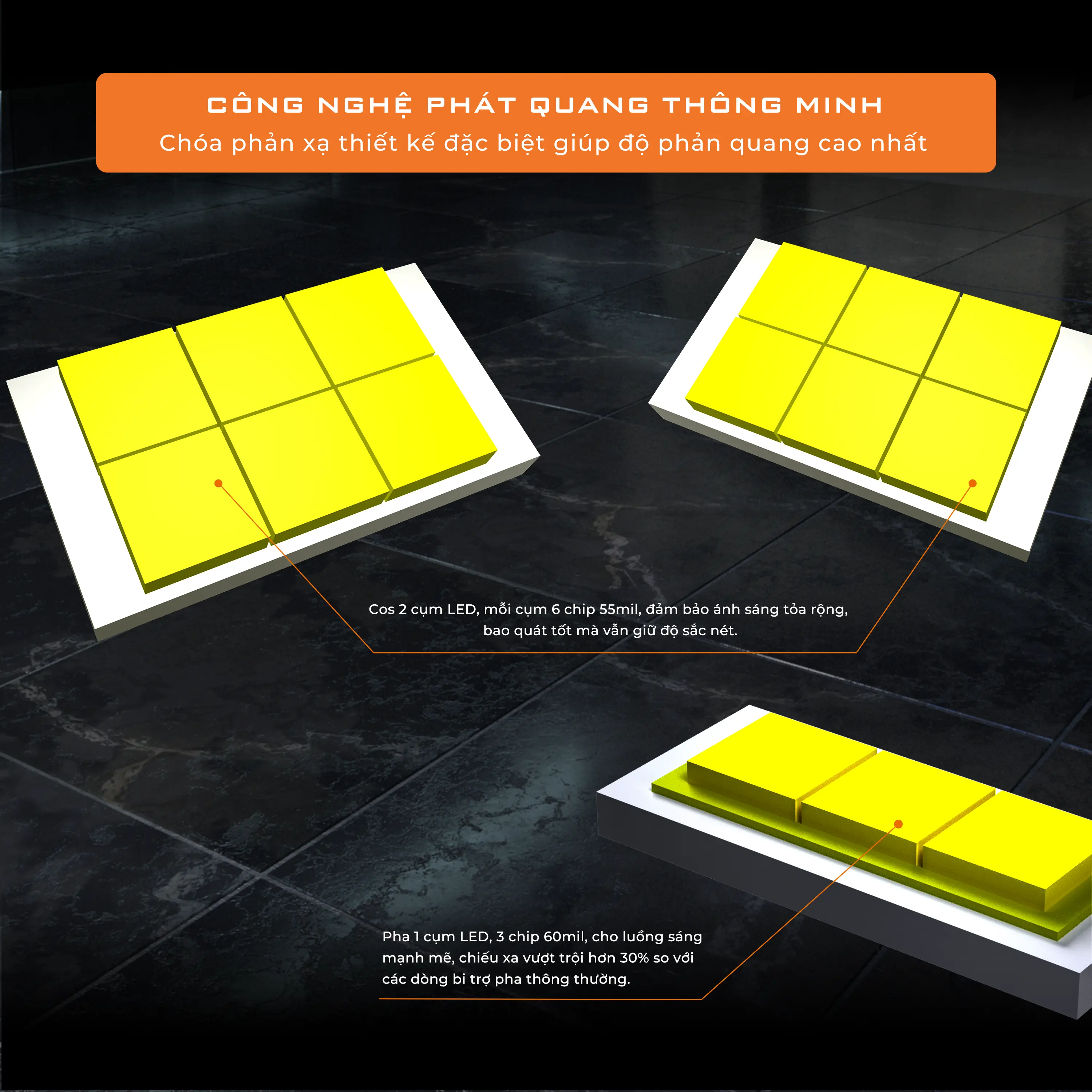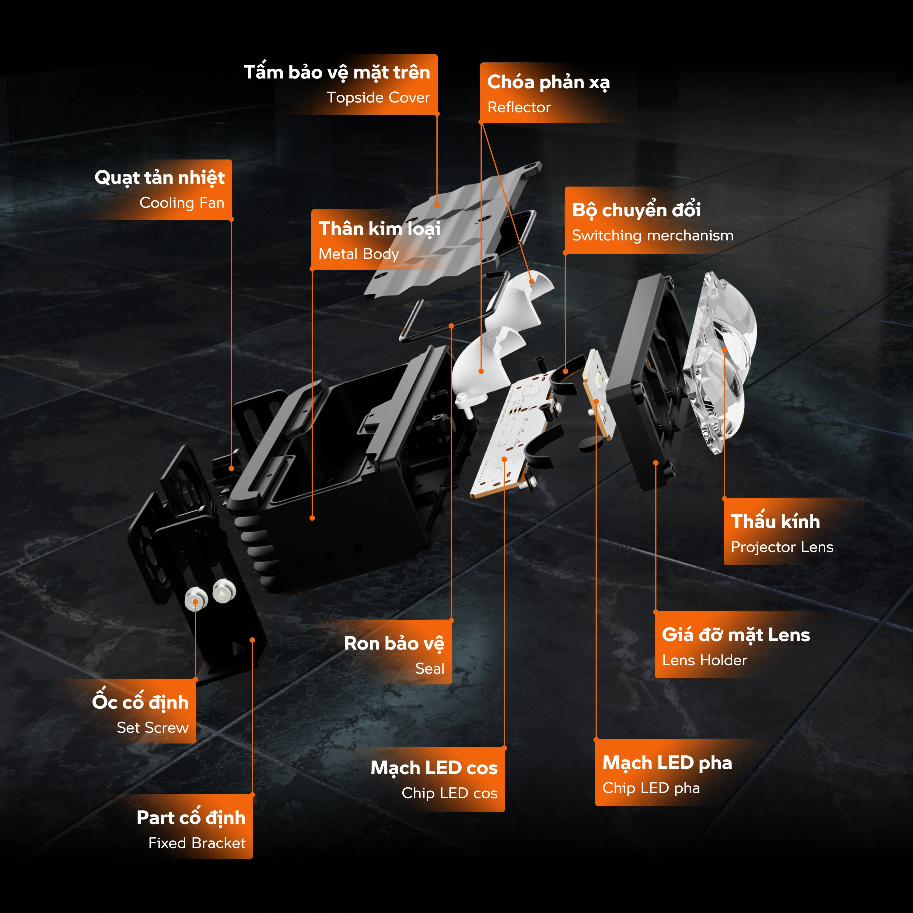 Cấu trúc 3 bi tích hợp với vỏ hợp kim giúp đèn bền, chống chịu và chống gỉ sét, bảo vệ các chi tiết trong thân đèn