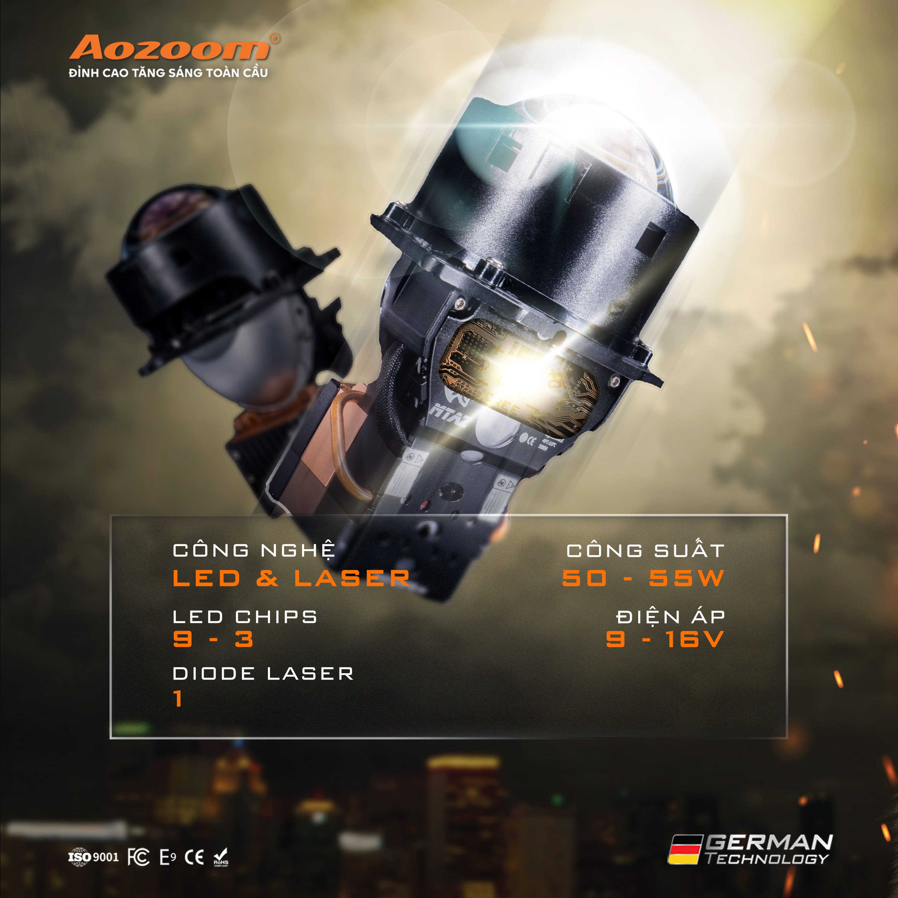 Bi LASER sở hữu công nghệ đặc biệt của AOZOOM “lên pha giảm cos” giúp cho mắt của người lái xe điều tiết theo chùm pha, quan sát rõ ràng hơn.