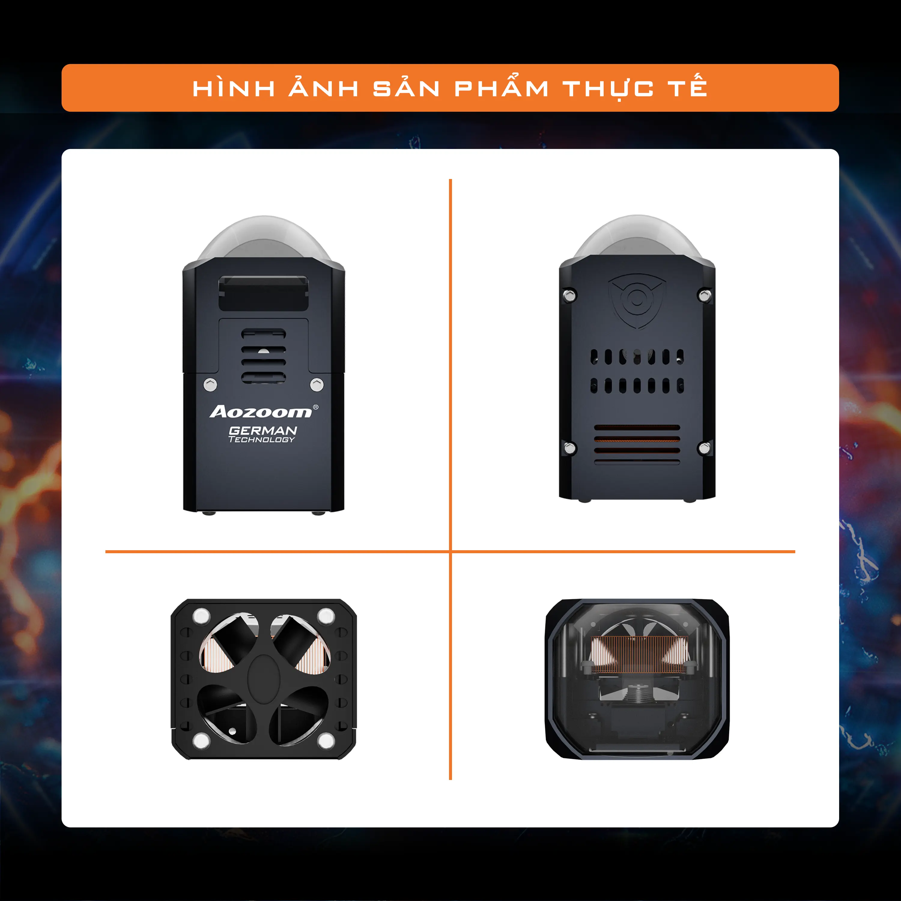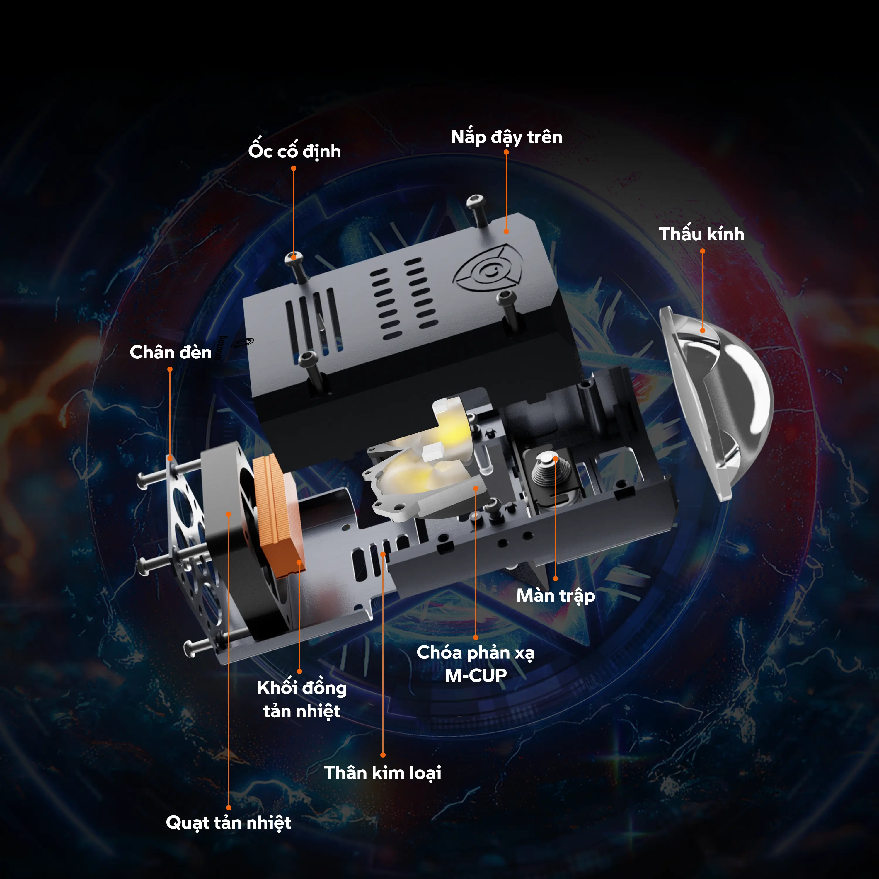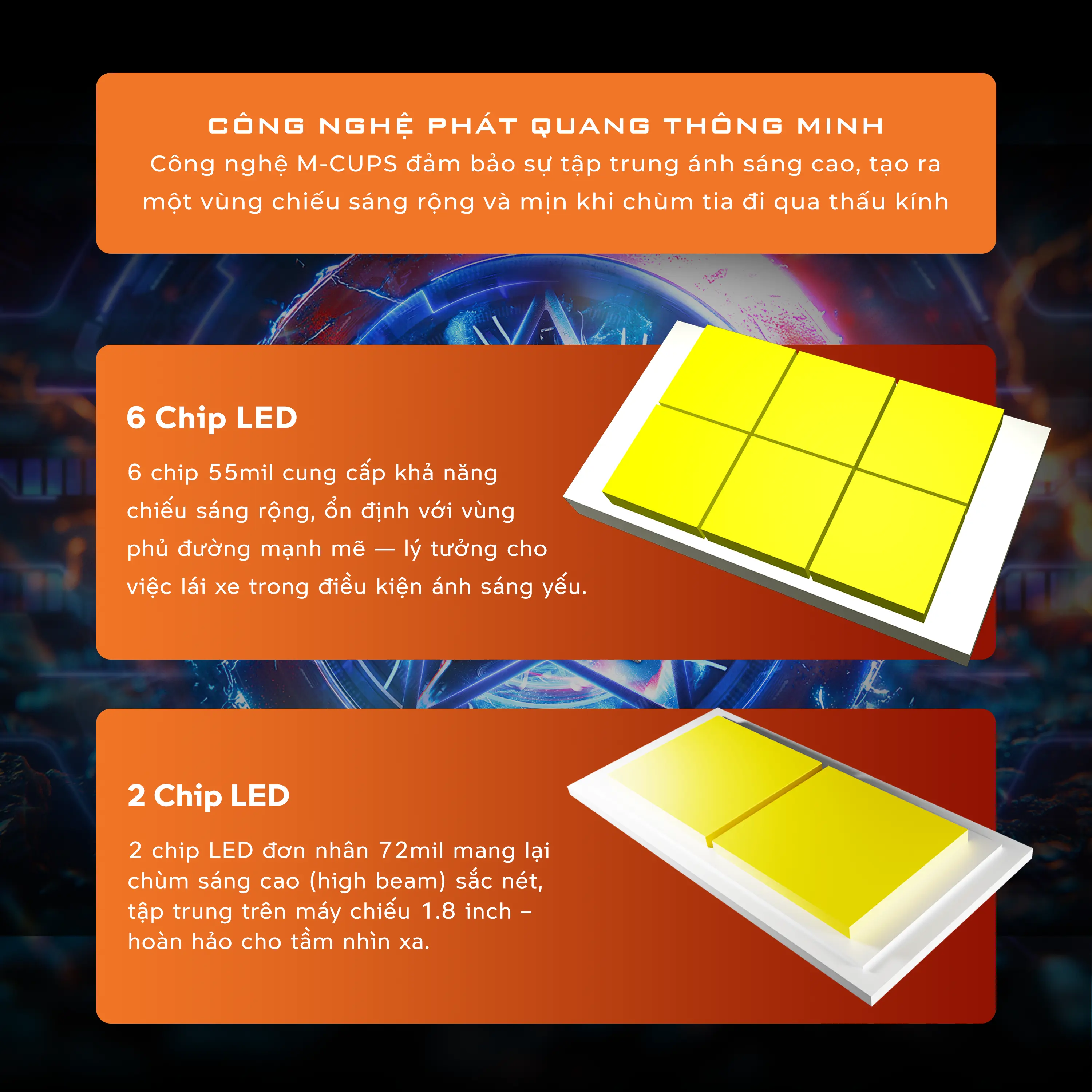 Ứng dụng công nghệ chóa phản xạ M-CUP với 6 + 2 chip LED bản lớn tạo nên nguồn sáng cos rộng mịn, tăng cường công suất phát sáng lên 40%.