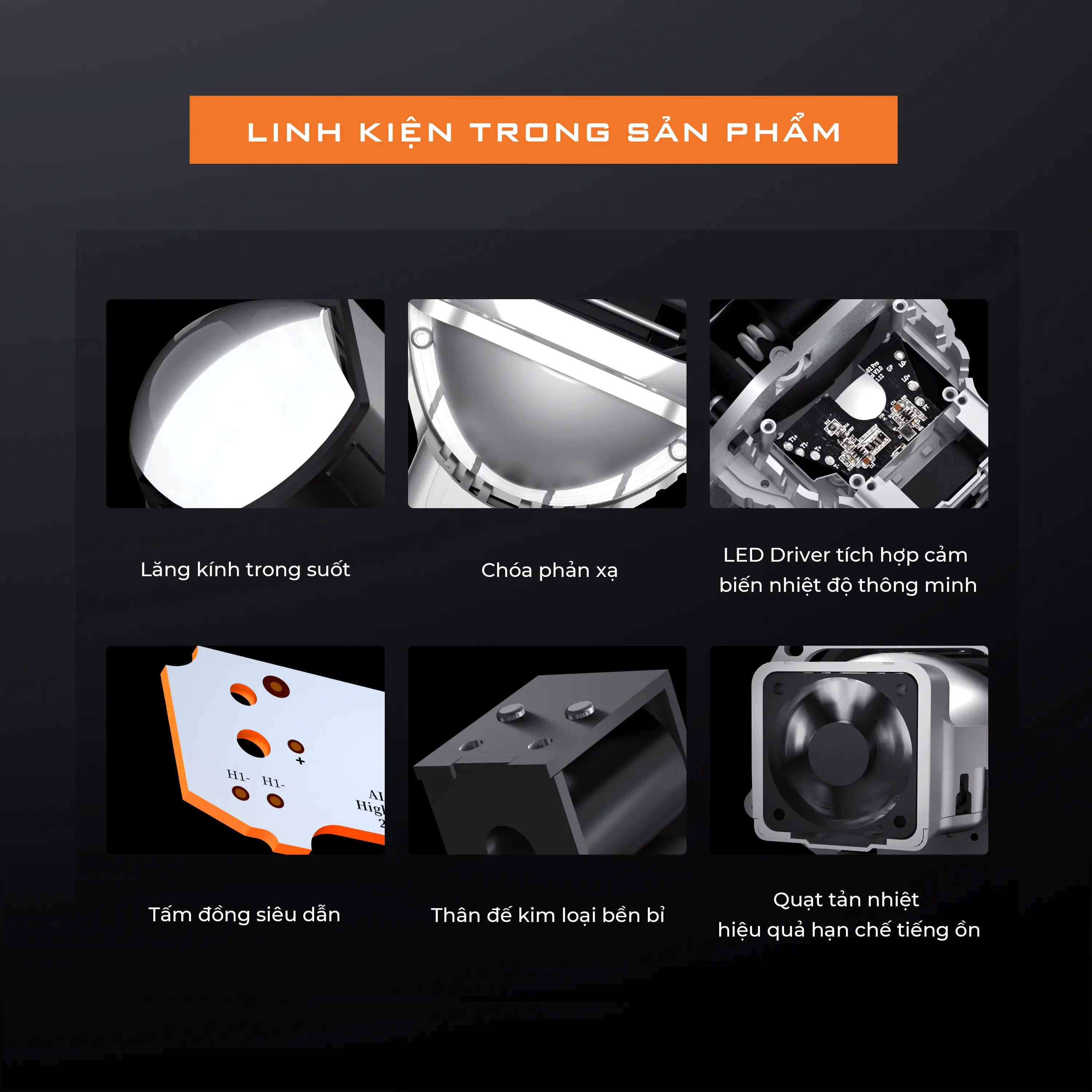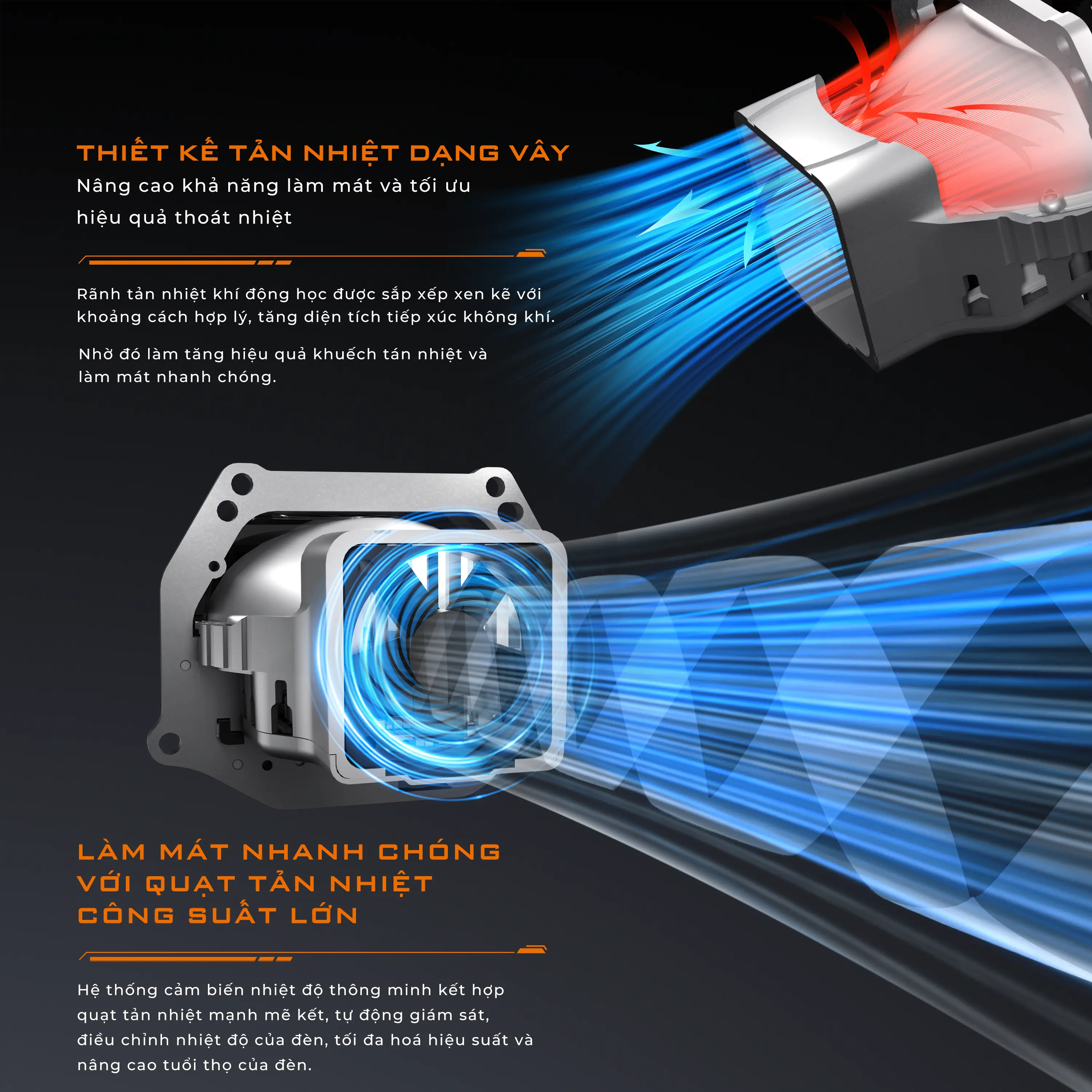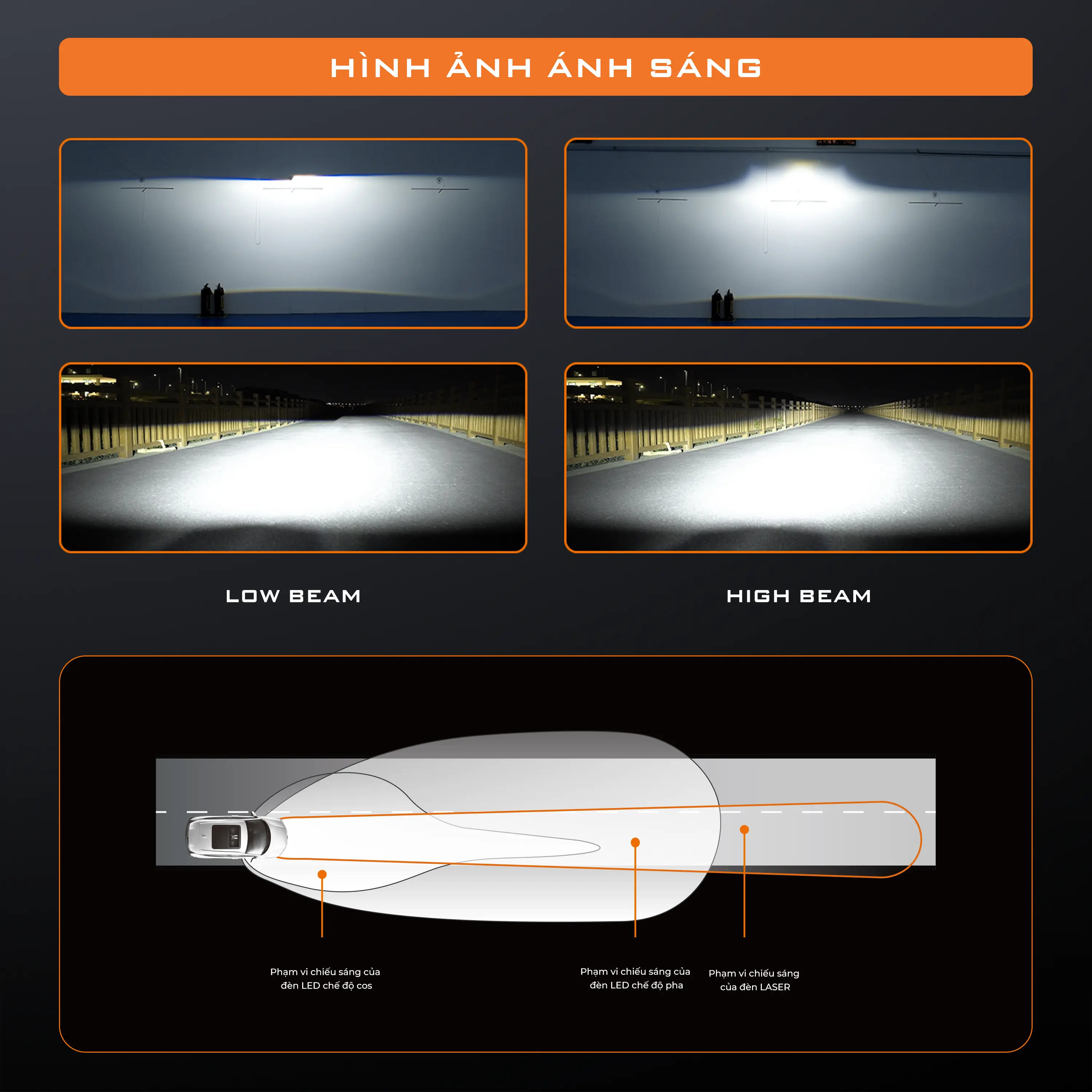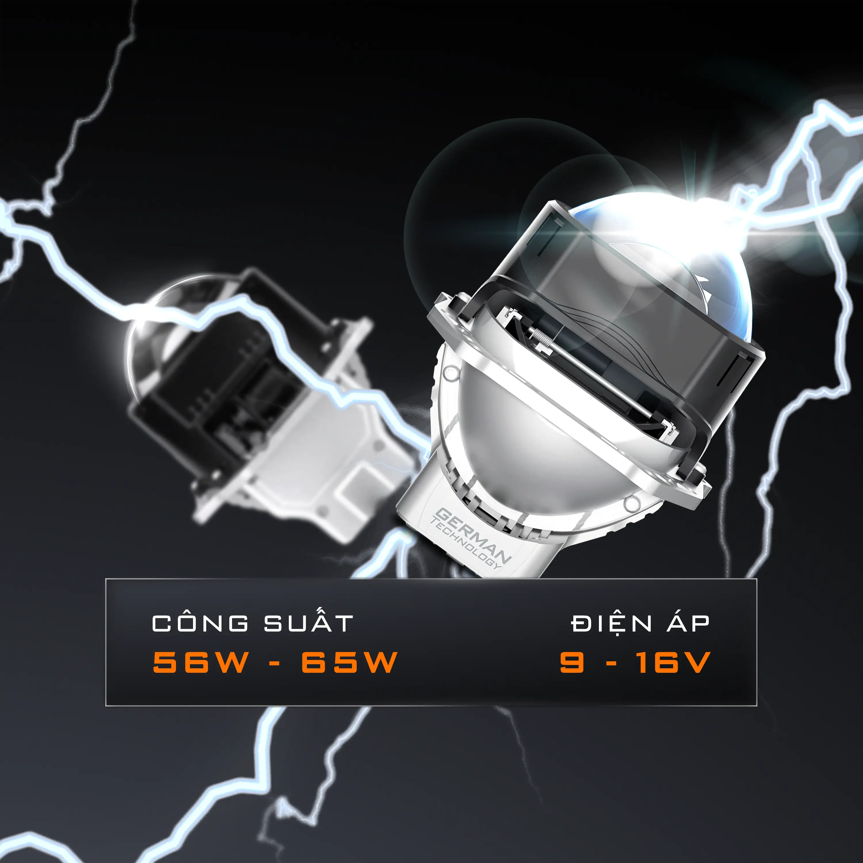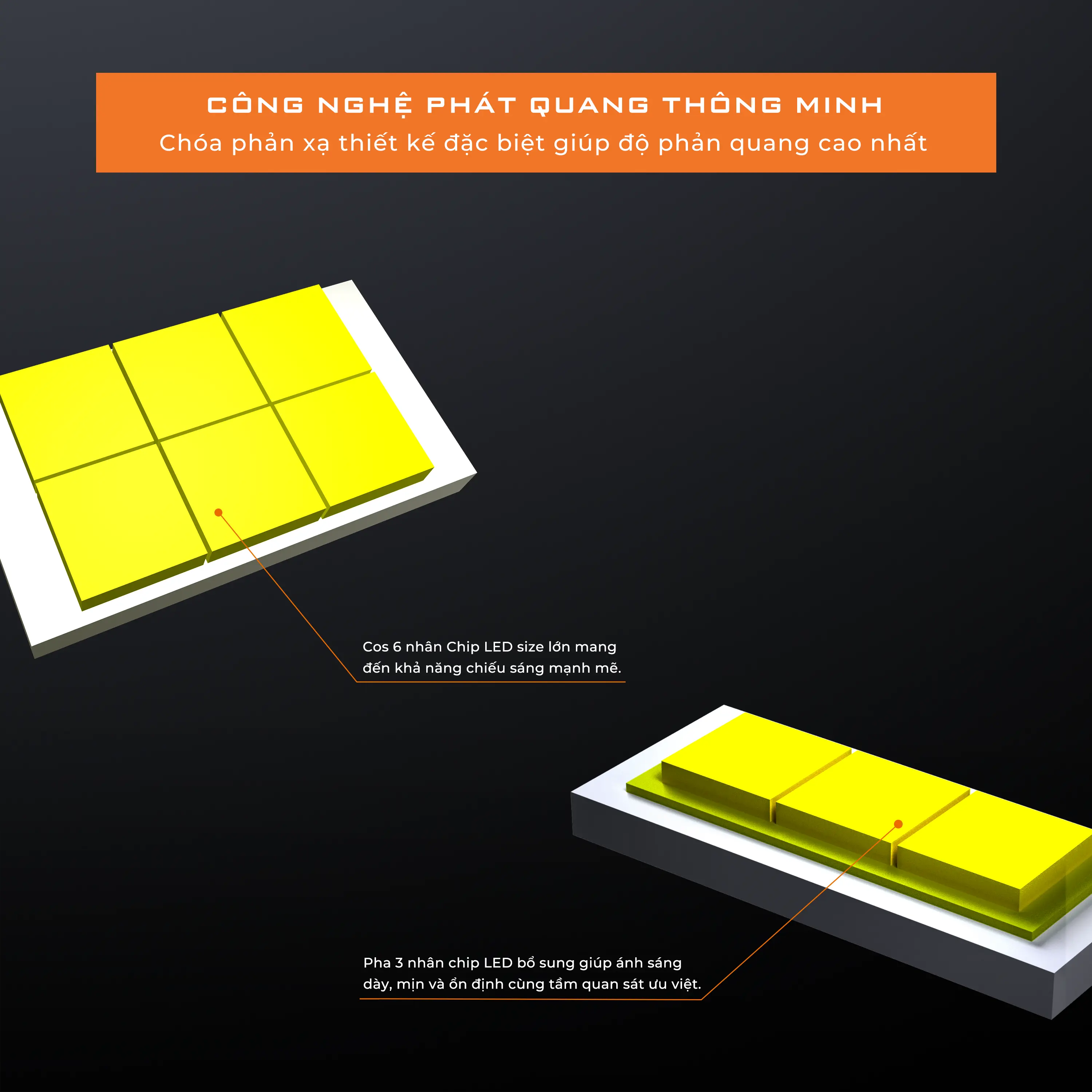 9 chip LED Đức độc quyền cùng 2 chóa phản xạ tăng độ thoát sáng, ánh sáng trải đều và chùm pha rõ nét.