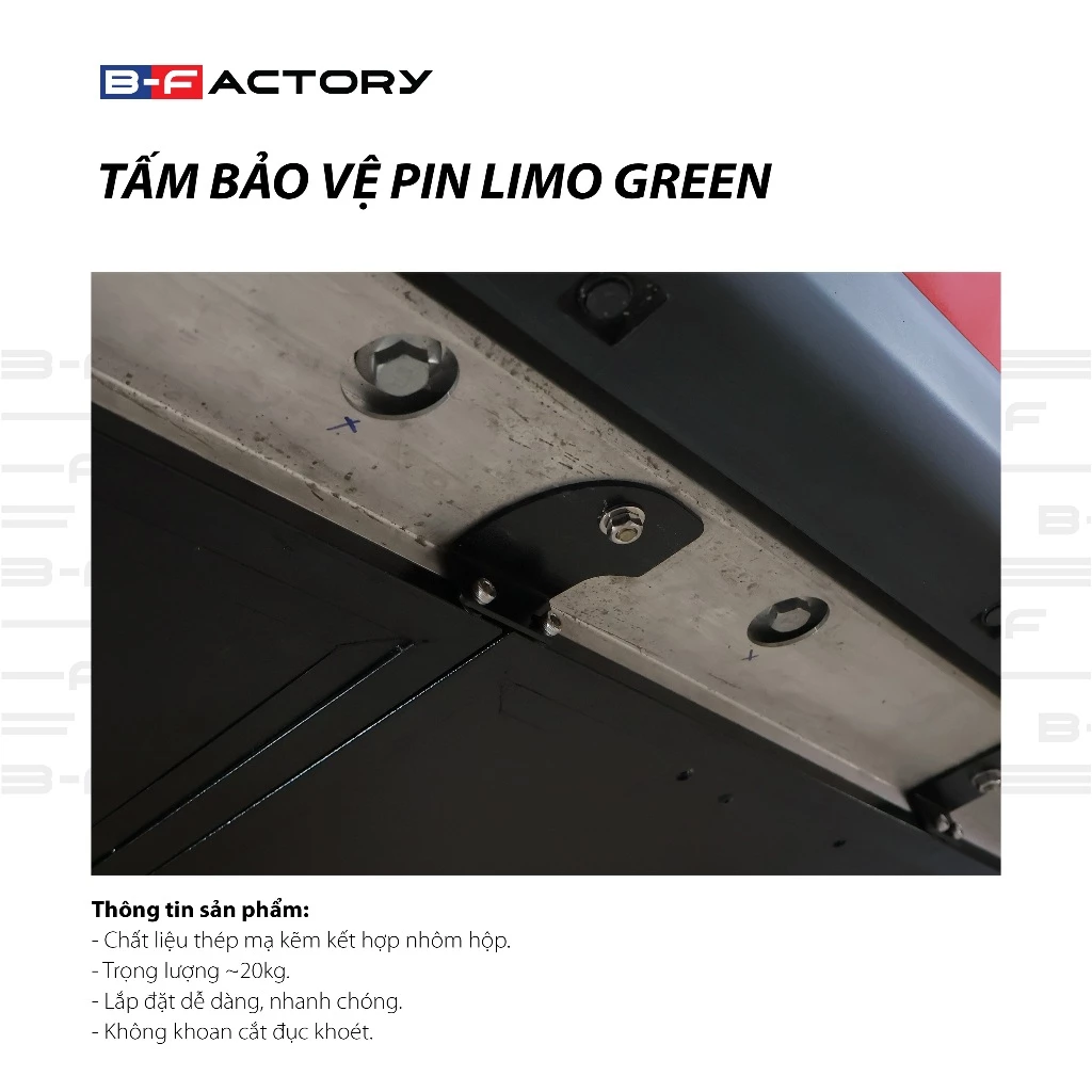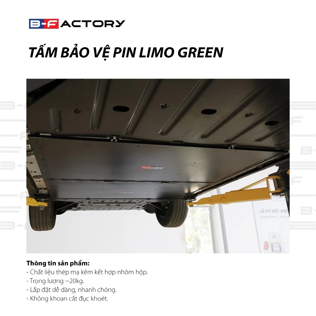 TẤM BẢO VỆ PIN 2 LỚP LIMO GREEN của nhà B-Factory là một phụ kiện được thiết kế đặc biệt để lắp dưới gầm xe điện (chủ yếu là xe VinFast) nhằm bảo vệ cụm pin khỏi các tác động như va đập, đá văng, ngập nước, bụi bẩn và môi trường. Sản phẩm được làm từ thép mạ kẽm và hợp kim nhôm có độ cứng cao, chống gỉ sét và ăn mòn, giúp kéo dài tuổi thọ và đảm bảo an toàn cho xe.
